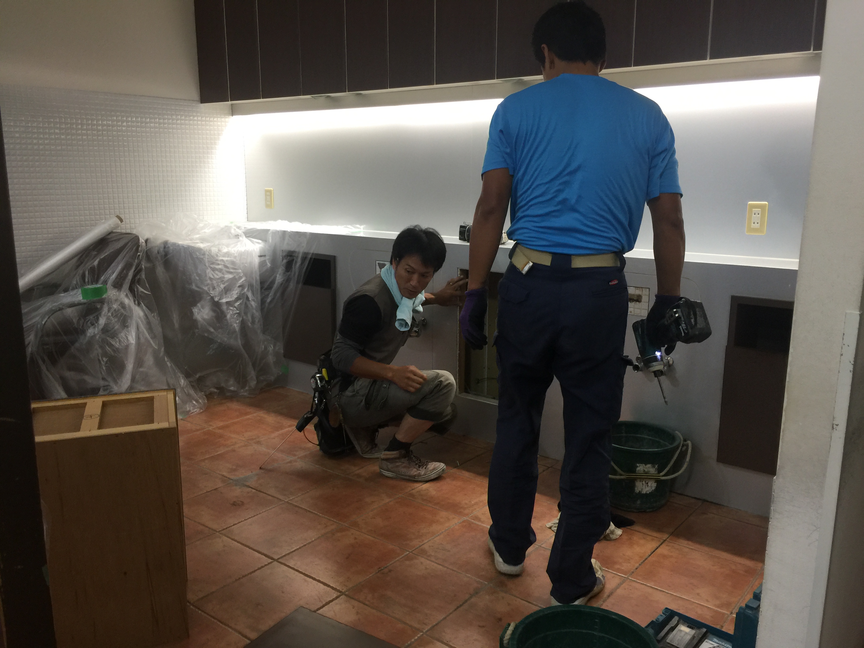 給排水・電気 配管を埋め、タイル貼りの仕上げ。