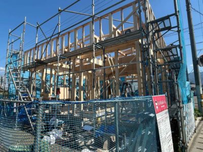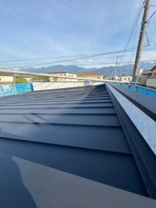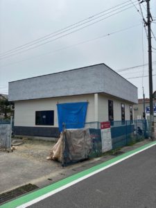 6月に屋根材やサイディングが取り付けられて建物らしい見た目になります。
