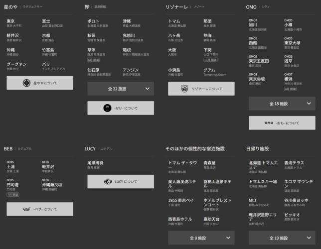 星野リゾートには「星のや」「界」「OMO」など、それぞれ異なるコンセプトを持つ施設が全国各地に展開されています。